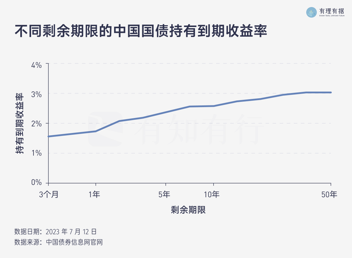 将某一天不同期限的国债到期收益率连成一条线,就形成了当天的国债收益率曲线,它代表了投资者当下买入某一个期限的国债并持有到期可以获得的年化收益率。国债收益率曲线,可以直观地衡量不同期限的国债收益高低。下图展示的是 2023 年 7 月 12 日的国债收益率曲线,从图中我们可以看出,剩余期限越长的国债,持有到期的收益率越高。大多数时候,国债收益率曲线都是如此。