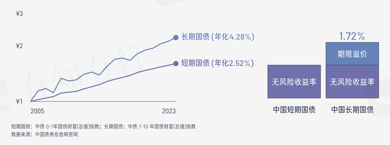 期限溢价长期存在,也能从历史数据中证实。2005~2023 年这 16 年,中国的短期国债(中债-0-1年国债指数)年化收益率为 2.52%;中国的长期国债(中债-7-10年国债指数)(其中2005、2006 年收益为估算数据,参考《中国大类资产投资 2023 年报》)年化收益率为 4.28%,比短期国债高 1.72%。也就是说,中国 7-10 年期限的国债相对于 0-1 年期限的国债的长期平均期限溢价为 1.72% 左右。