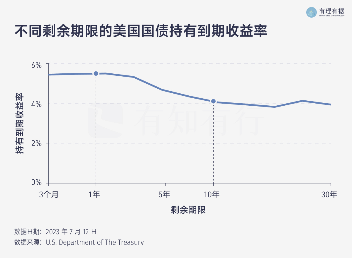 由于长期国债投资时间长,少数情况下,长期国债收益率可能低于短期国债收益率,这种情况被称为「收益率倒挂」。比如,从 2022 年开始为了应对通货膨胀,美联储连续加息,就出现了美国 1 年期国债收益率比 10 年期还高的情况。
