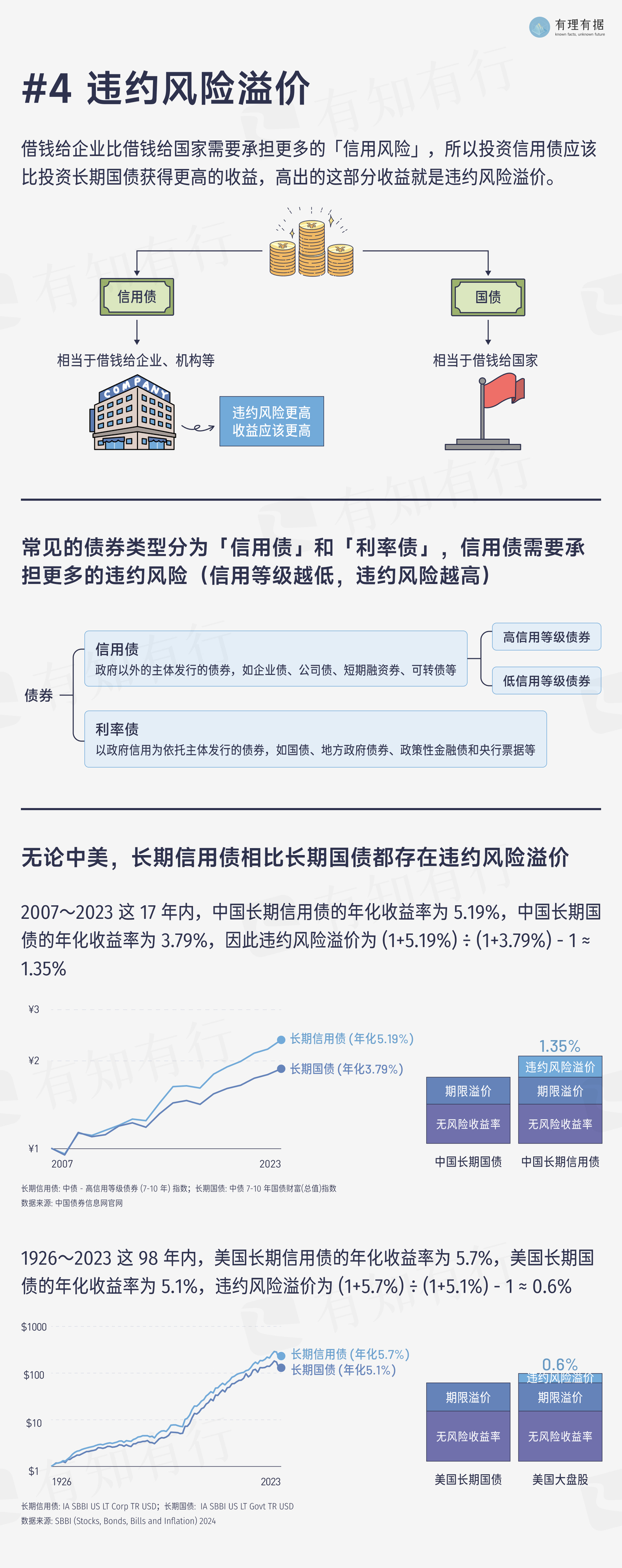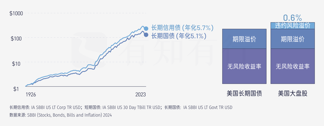 1926 ~2023 年这 98 年,美国长期信用债年化收益率为 5.7%,美国长期国债年化收益率为 5.1%,违约风险溢价为 0.6%。