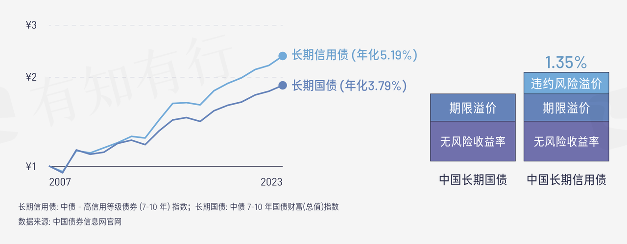 2007~2023 年,中国 7-10 年高信用等级信用债年化收益率为 5.19%,长期国债年化收益率为 3.79%,违约风险溢价为 1.35%。