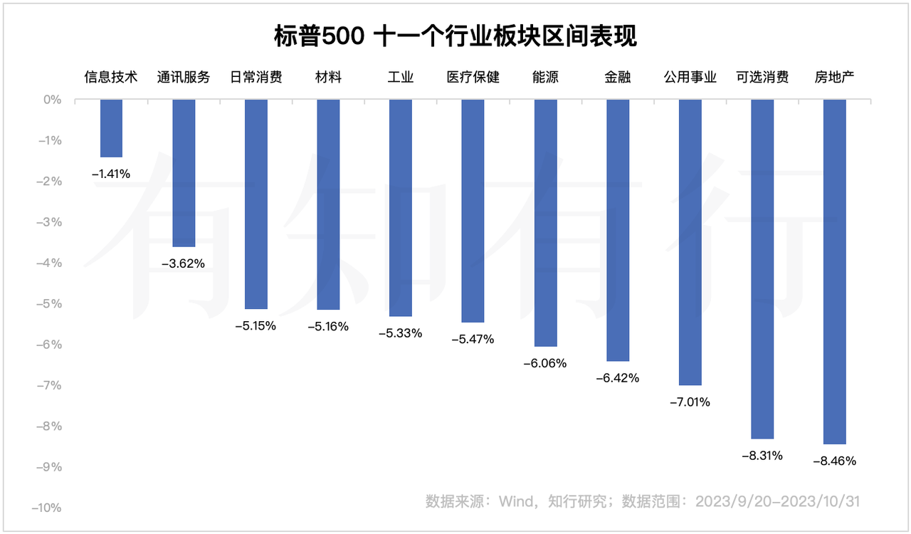 9 月中旬到 10 月底的市场笼罩在高利率持续的不安中,震荡下行。我们可以看到,自2023 年 9 月 20 日海外长钱上线起,截至 2023 年 10 月 31 日,标普500指数下跌 4.73%,标普500等权指数下跌 6.89%,纳斯达克100指数下跌 3.74%。