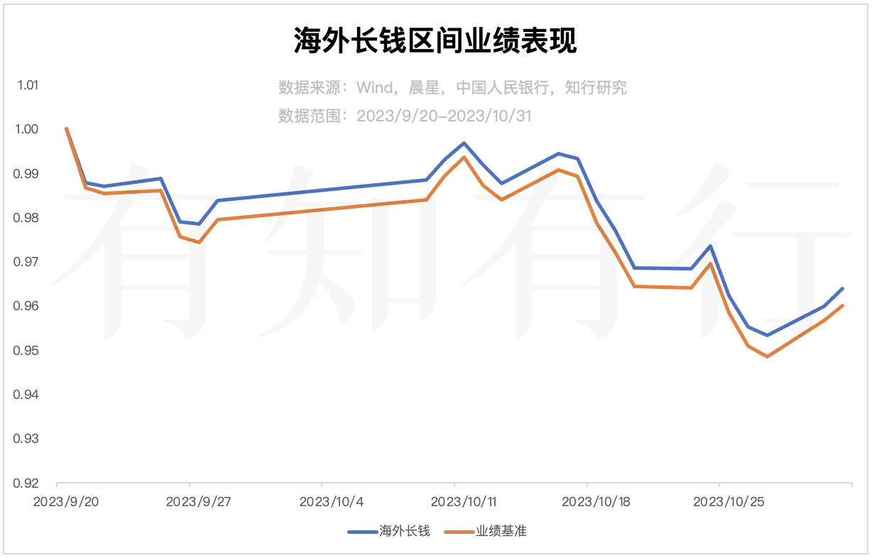让我们看一下海外长钱自 9 月 20 日上线以来的表现,虽然目前海外长钱并没有对外展示业绩,但我们可以基于公开数据,通过研究分析其成分基金的表现测算出,截至 2023 年 10 月 31 日,海外长钱累计收益为 -3.6%。海外长钱的业绩基准是 70% 标普500指数(经人民币汇率调整后)+ 30% 晨星全球核心债券指数(经人民币汇率调整后),我们也大致推算了业绩基准的区间表现,如下图所示。