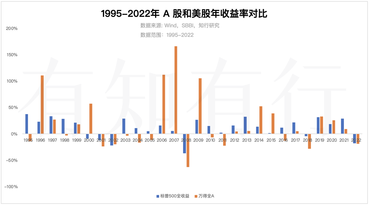 1995 年至 2022 年,万得全A的年化收益率为 9.50%,标普500全收益指数的年化收益率为 9.94%。光从年化收益率上来看,两个市场的差别不大。但从波动率上看,两个市场的差别就大了。同期,万得全A的年化波动率为 51%,标普500的年化波动率仅为 18%。