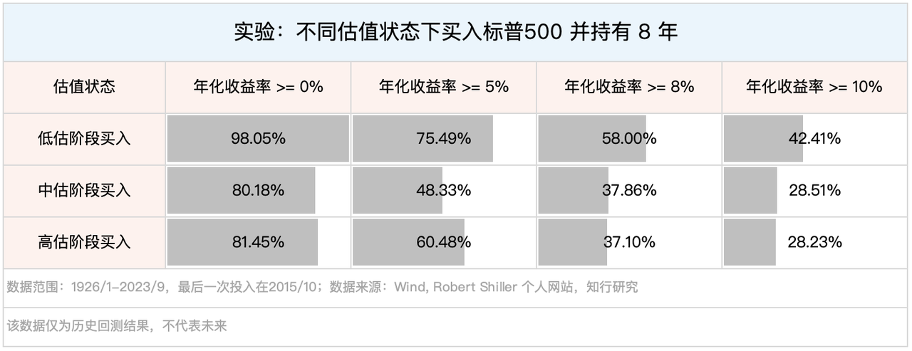 从过去 100 年左右的数据回测中,可以发现标普500在中估和高估阶段买入后的长期收益率没有明显区别,有时候甚至出现高估状态下买入的长期胜率高于中估状态的现象。说明席勒 PE 作为估值指标,在中高估值状态下的指导性不高,择时似乎失效了。