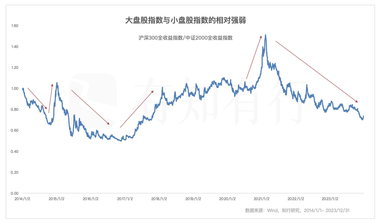 如果我们用沪深300代表大盘股指数,中证2000代表小盘股指数(为了体现股息收益,分别选择了它们的全收益指数)将二者的涨跌情况进行比对,可以得出某一阶段里二者的相对强弱关系。如上图所示,由于中证2000全收益指数的数据开始于 2014 年年初,我们计算了两个指数从 2014 年年初至今,沪深300全收益指数相对于中证2000全收益指数的强弱关系变化。