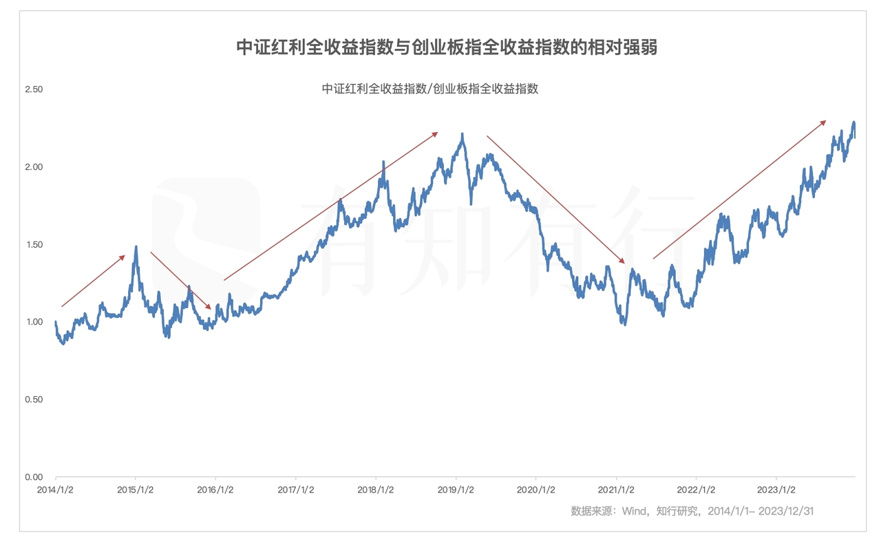 同样的争论也发生在价值风格(红利风格)和成长风格之间。上图展示了同样时间区间内,中证红利全收益指数相对于创业板指全收益指数的相对强弱关系。曲线上涨,代表这个阶段是中证红利全收益指数跑赢,反之则是创业板指全收益指数表现更好。价值与成长风格的分化以及轮动现象在过往的A股也很明显。
