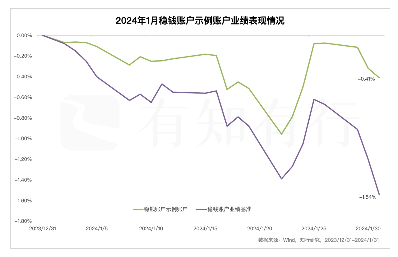 面对股市大跌的局面,我们来看一下稳钱账户的业绩表现。今年一月份,稳钱账户示例账户的收益率为 -0.41%,这个业绩是扣除了投顾费后的业绩。同期,稳钱账户的业绩基准收益率为 -1.54%,在一月份,稳钱账户表现好于业绩基准。(稳钱账户以及业绩基准的业绩均由wind的公开数据推算得出)