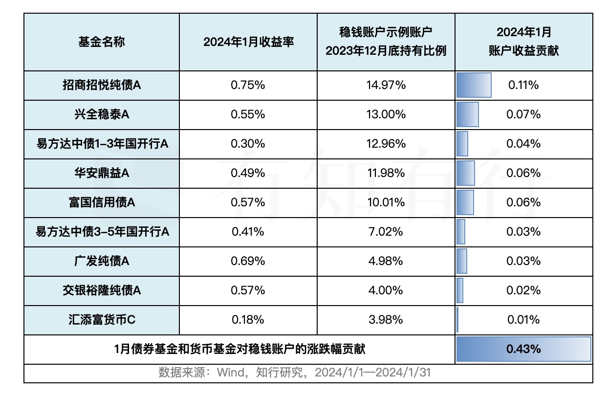 首先是债券基金和货币基金部分。下面展示了稳钱账户持有的债券基金和货币基金在一月份的收益率表现,结合它们在账户里的持仓比例,可以得出它们一月份对于稳钱账户整体的贡献情况。