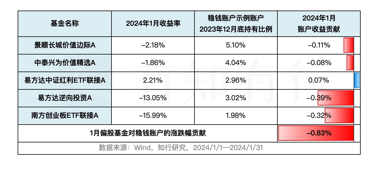 偏股基金方面,代表偏股基金平均水平的万得偏股混合型基金指数在一月份下跌了 14.06%。下图展示了稳钱账户持仓的偏股基金的业绩表现。