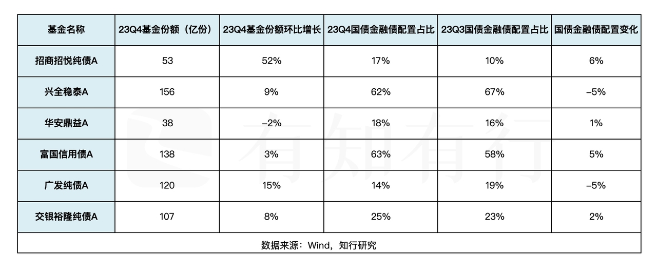 首先是主动债券基金,上图展示了每个基金的份额变化情况以及债券品种配置情况。从份额变化情况来看,没有出现份额大幅度缩水、机构投资者大面积赎回的基金,整体份额保持稳定,有些基金的份额还是稳步增长的情况,这意味着市场上的投资者尤其是机构投资者对于这只基金是认可的。