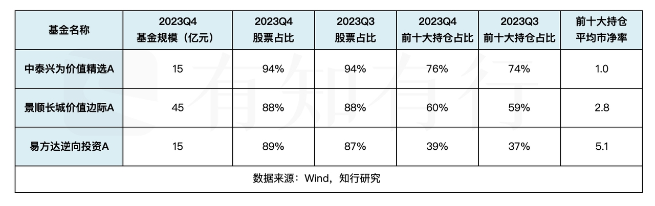 从 3 只基金的四季度前十大持仓的平均市净率来看,中泰兴为价值精选的平均 PB 为 1.0,为明显的低估值价值风格;易方达逆向投资的平均 PB 为 5.1,更加偏向于成长风格投资;景顺长城价值边际则介于两者之间,平均 PB 为 2.8,三者之间不同的持股风格也能起到一定的对冲作用。当然,基金经理的风格稳定性不是只关注估值,还会看基金经理的持仓操作是否符合他的投资理念和投资框架。由于这部分比较复杂,我们留待日后详细说。
