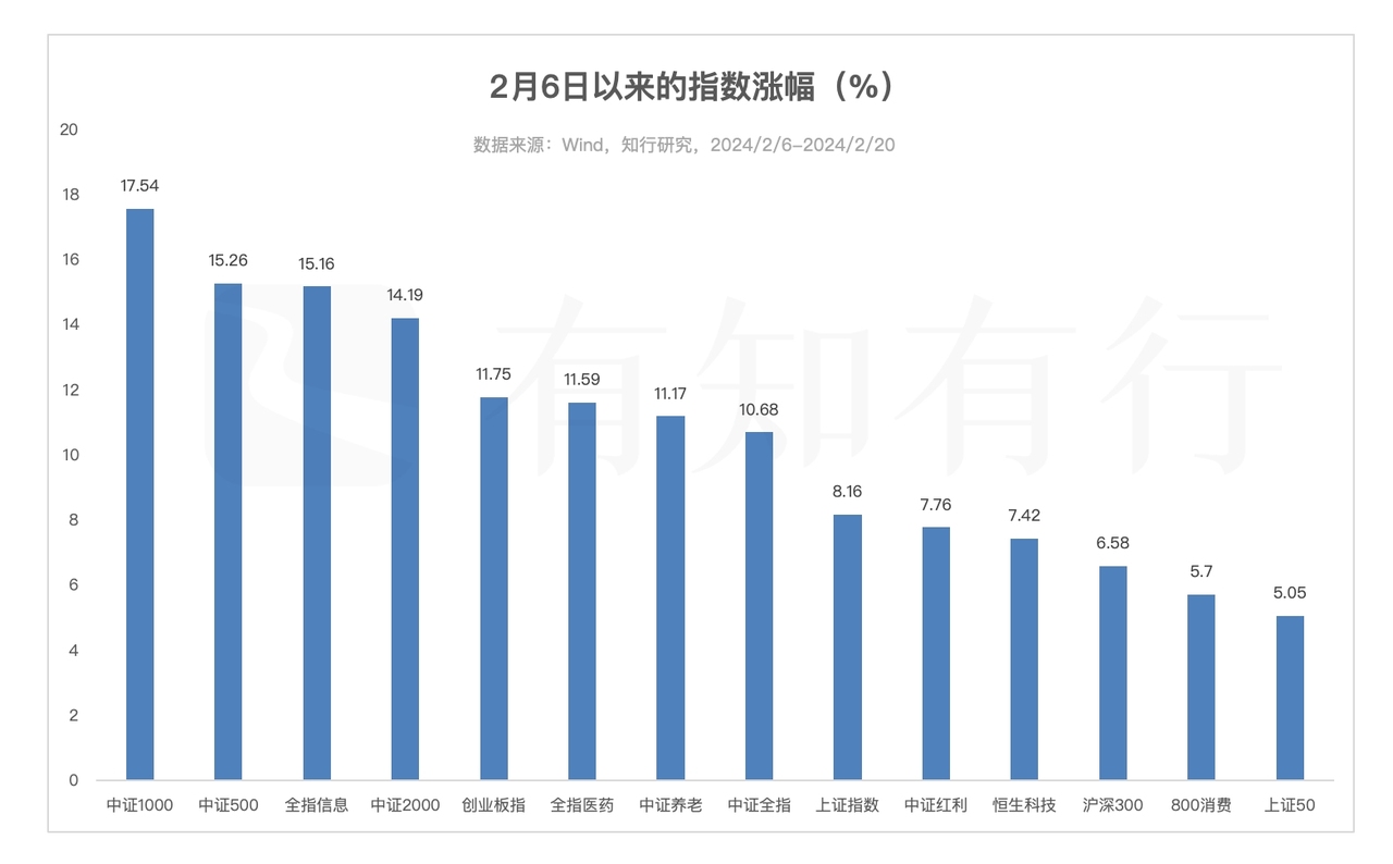 上图展示了主要指数 2 月 6 日到 2 月 20 日本周二的区间表现,所有指数都出现了上涨。之前下跌较多的中小盘指数和全指信息等行业指数,在这次上涨中排名居前。
