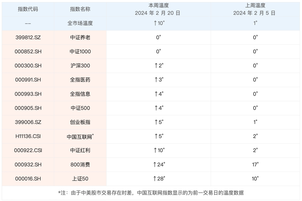 具体指数来看,上面图表里的指数都出现了上涨,温度大多出现了提升。如果你仔细看的话,会发现中证红利最新温度来到了 10°,只比上证50和800消费低一些了。