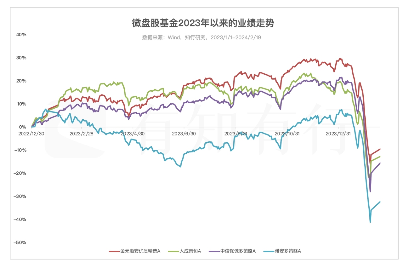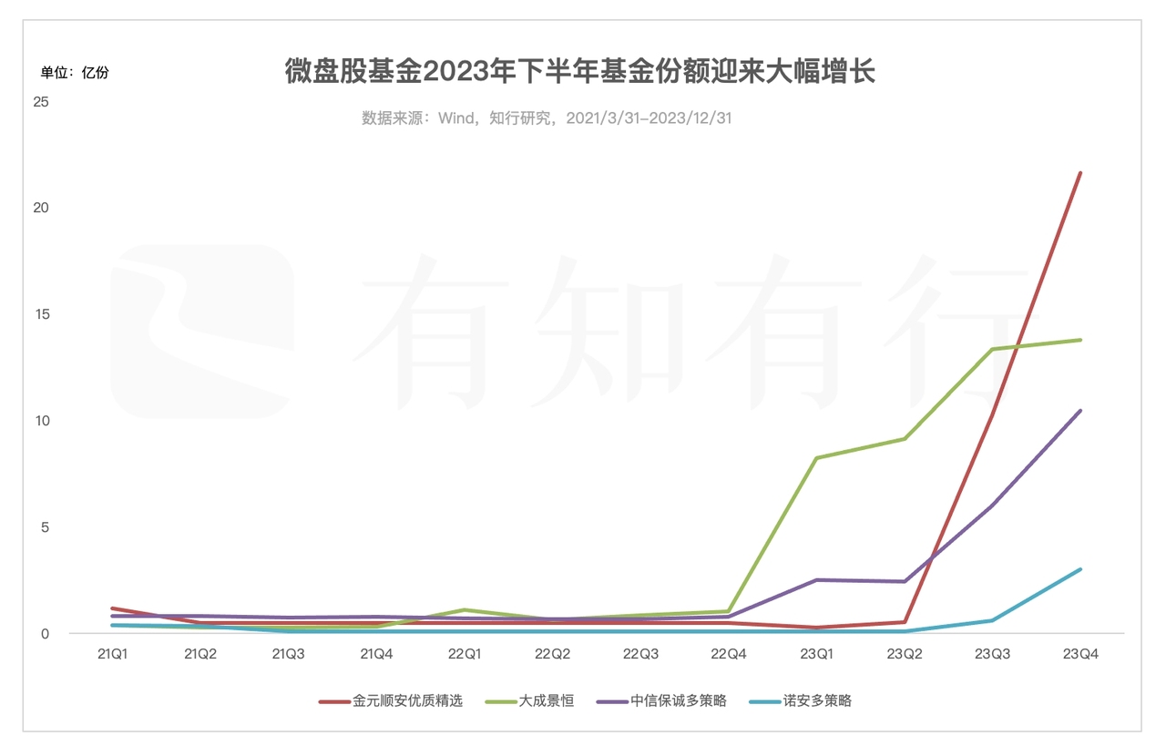 最后,我们来简单说一下微盘股以及相应基金的情况。不知道大家还记得去年火爆的万得微盘股指数么?这个指数在 2023 年上涨了 50%,它包括了全部A股里市值居于后 400 位的个股,成份股总市值中位数在 20 亿左右,比我们上面提到的中证2000的成份股市值规模还要小,被称为微盘股指数。