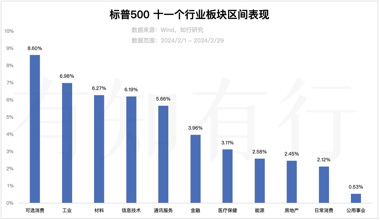 二月份,美国股票市场整体是上涨的。标普500十一个行业板块全部收涨,涨得最好的是可选消费,涨幅为 8.60%。当月,标普500指数上涨 5.17%,标普500等权指数上涨 3.96%,纳斯达克100指数上涨 5.29%。