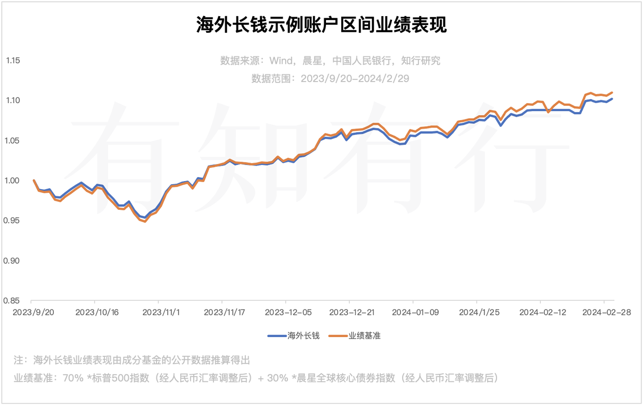海外长钱二月单月上涨 3.14 %,自 2023 年 9 月 20 日上线至 2024 年 2 月底,示例账户总回报为 10.13%。由于海外长钱在一月份调整了持仓,所以不同时间段买入的用户,持仓可能略有差别。