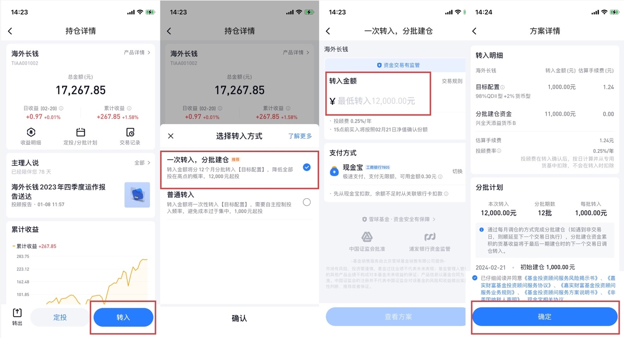 值得注意的是,目前「一次转入、分批建仓」的起购金额较高,是 12000 元人民币。如果你单次投入金额超过 12000 元人民币,海外长钱会默认使用「一次转入、分批建仓」的转入方式。如果你不希望采用分批投入的方式,请在选择投入方式的页面主动选择「普通转入」。