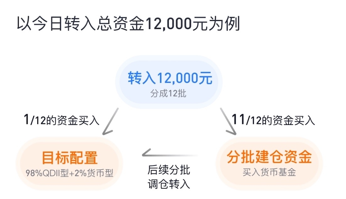 选择「一次转入,分批建仓」后,海外长钱会将投入资金分成 12 批,分 12 个月完成调仓。每个月将 1/12 的资金买入目标配置,剩余的待调仓资金会买入货币基金。具体流程如下图所示。