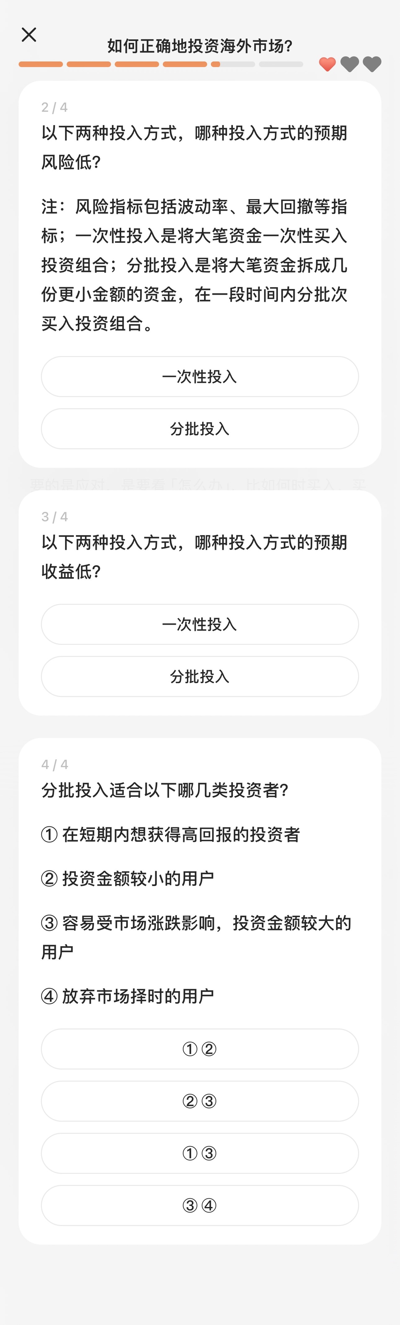 这个投入方式,主要是区别普通一次性投入。海外投资知识测评中,关于分批投入与一次性投入的题,不知大家还有没有印象。相比普通一次性投入来说,分批投入的预期收益和风险都更低。