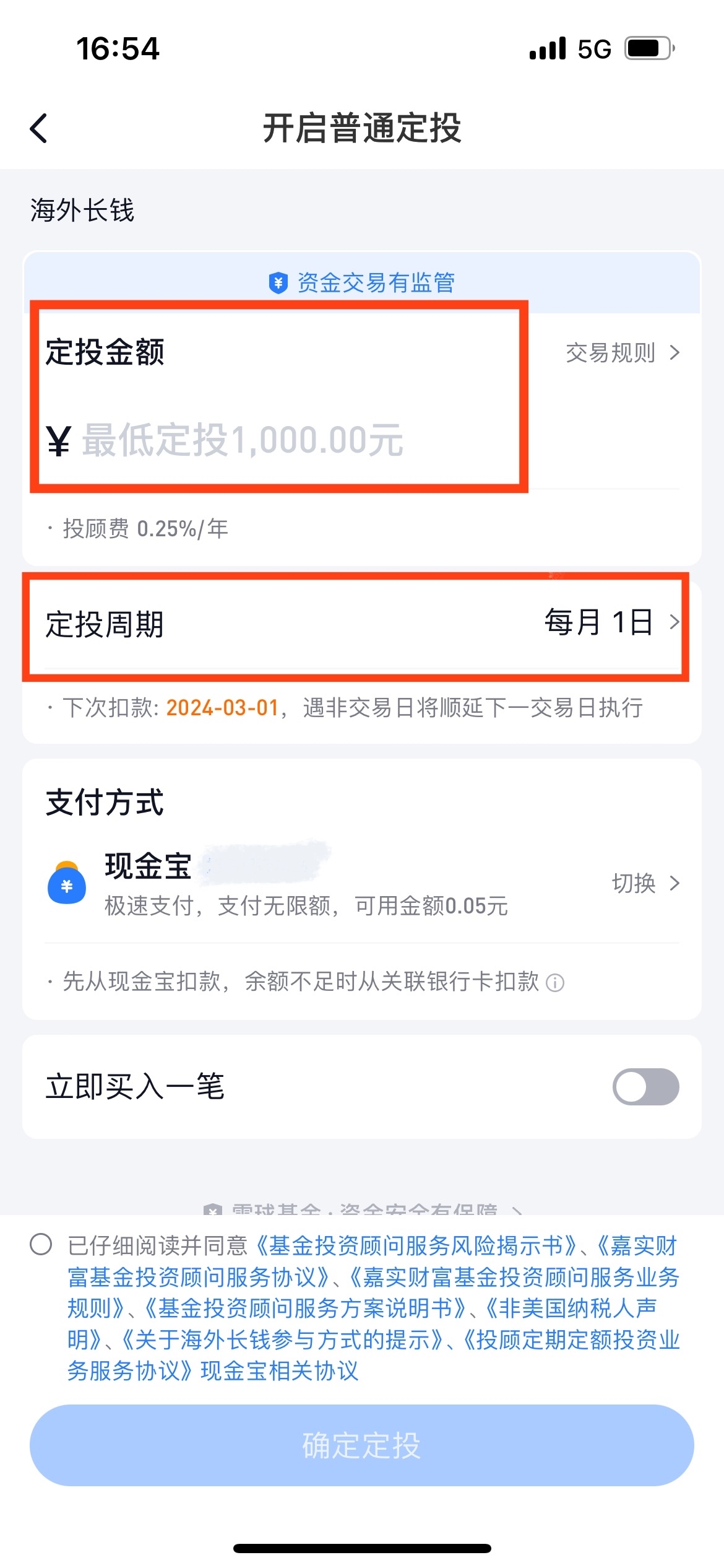 大家在设置定投计划时,需要输入每次定投的金额和定投周期。一旦定投计划开启,就默认长期定投了,没有特殊情况不会主动终止。所以它更适合使用定期现金流投资的朋友,例如每月发工资了,用一部分工资买入海外长钱,这样的情况下更适合定投。