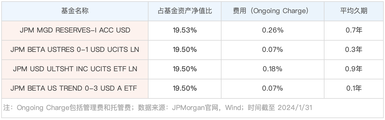 摩根海外稳健配置 2023 年第四季度报告中,披露其配置了 76% 的境外公募基金,下面列出了前四大持仓基金。这些基金都是配置短债和现金为主的,投资地域也主要是美国,平均久期都在一年以下。它们的持有费率(Ongoing Charge)都是比较低的。