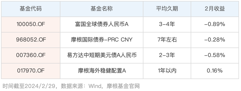 2022 年美联储加息以来,美债收益率一直处于倒挂的状态。截至 2024 年 2 月底,十年期美国国债收益率在 4.2%左右,一年期美国国债收益率在 5.0% 左右。短债现阶段的到期收益率高,风险也更低一些,一旦降息,长债的弹性则会更好。我们看到海外长钱持仓的债券基金也在不同久期上做了分散,一般来说在国债收益率下行时,久期长的基金表现得更好,在近期国债收益率重新上行时,短久期的资产则展现出了优势。