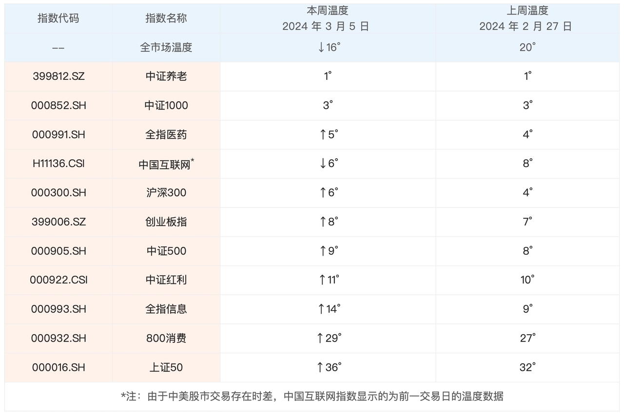 由于全市场里大多数个股出现下跌,最新的全市场温度降到了 16°。具体指数方面,由于多数指数赋予了大盘股更多的权重,因此最近一周出现了上涨。下跌的指数里,一个是中证1000,我们前面介绍过,小盘股指数最近一周表现不佳。另一个是恒生科技,港股今年依旧凄惨,除了高股息板块,其他大部分板块都出现了下跌。