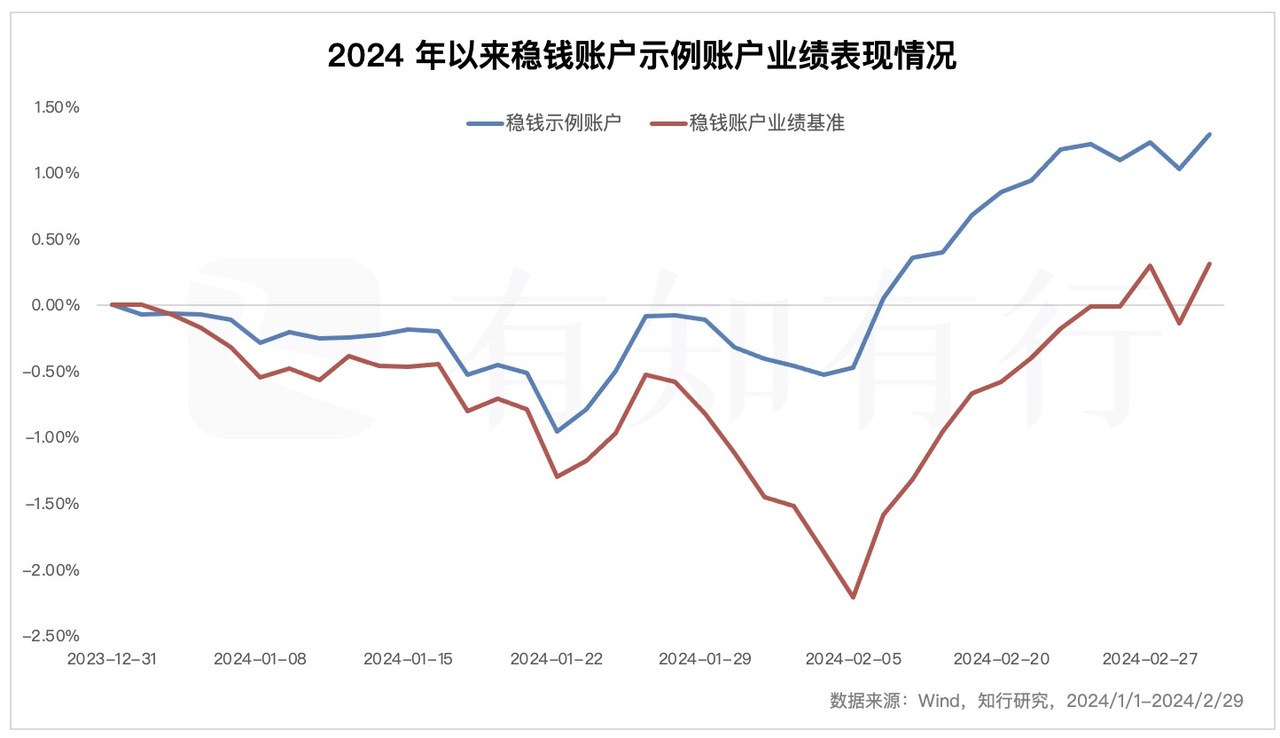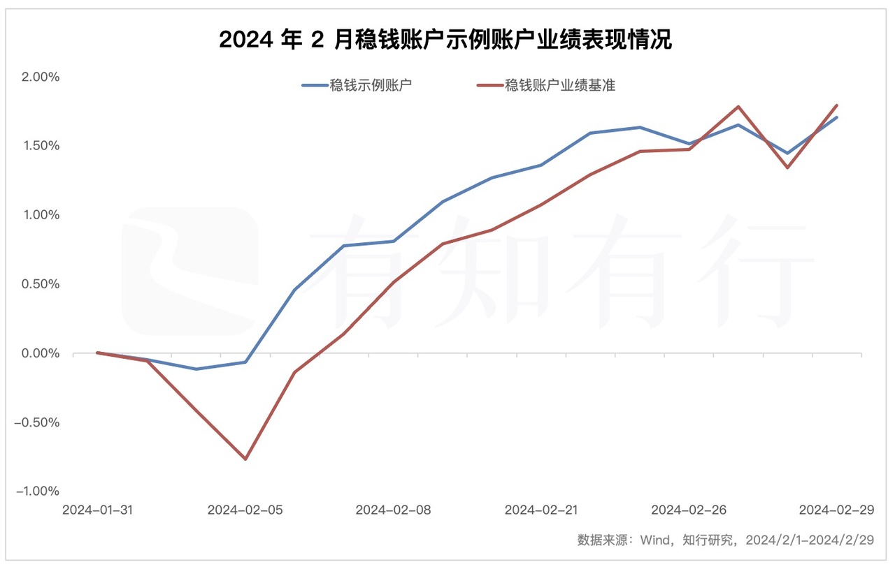 如果对比稳钱账户和业绩基准二月份的业绩的话,稳钱账户略有跑输。但从上图中,我们也会发现,相比于业绩基准,稳钱账户的业绩曲线的波动会更小,整体会更为稳健。