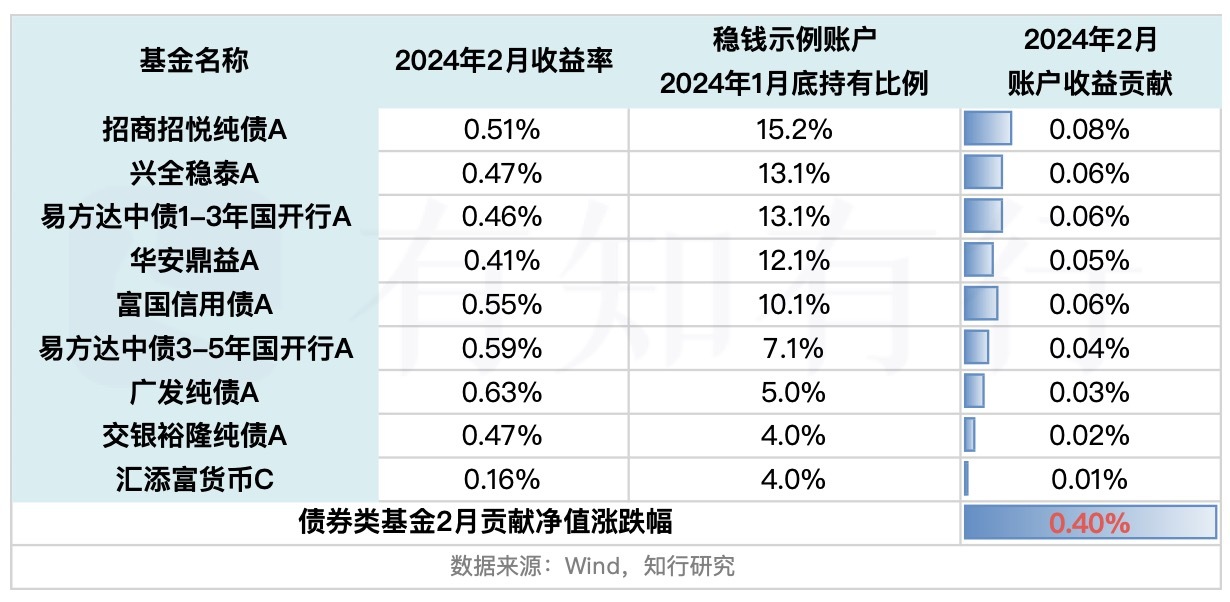 首先是债券基金和货币基金部分。下面展示了稳钱账户持有的债券基金和货币基金在二月份的收益率表现,结合它们在账户里的持仓比例,可以得出它们二月份对于稳钱账户整体的贡献情况。