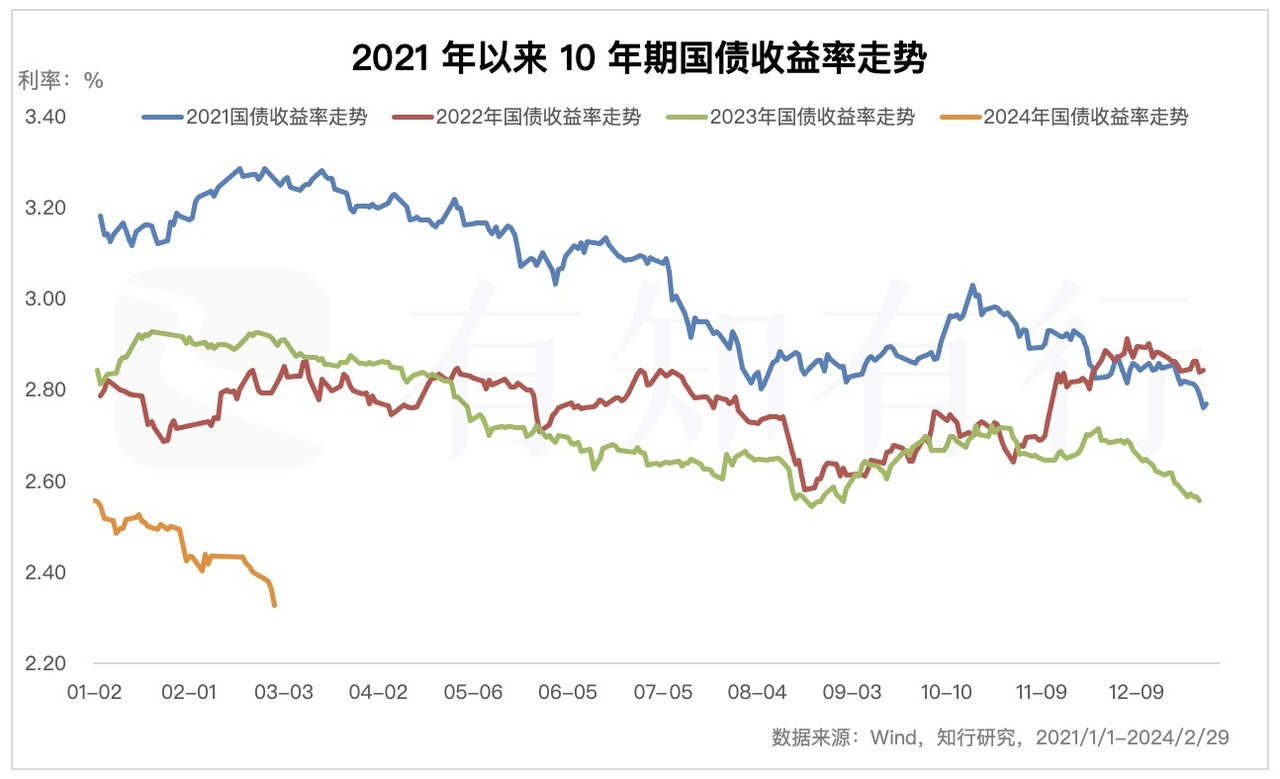 我们将今年以来,十年期国债收益率的走势与过去 3 年每年的走势放在一起对比,可以看到随着 2023 年国债收益率的持续下行,2024 年开年国债收益率就已经处于一个历史性低位,而此后这个低位记录则不断被打破。