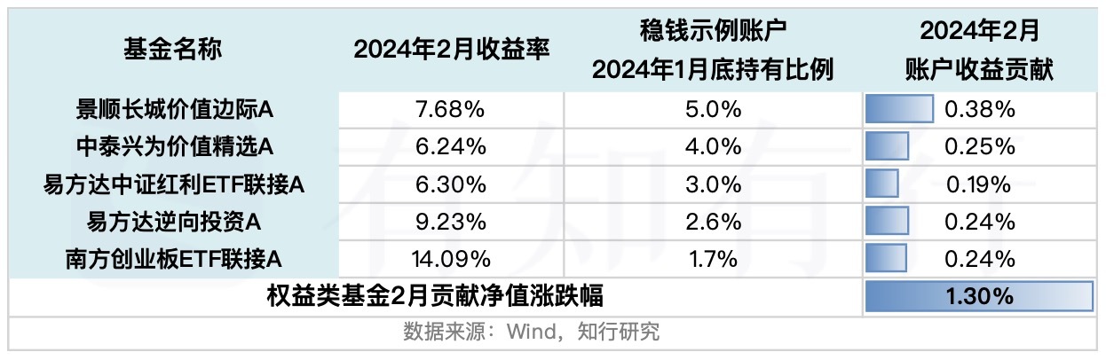 所以我们看到稳钱账户所持有的权益基金中,在一月份表现较好的易方达中证红利ETF联接A、景顺长城价值边际A和中泰兴为价值精选A,在二月的上涨中略微落后于市场平均水平;而在一月份表现靠后的南方创业板ETF联接A和易方达逆向投资A,在二月的表现就更为领先。