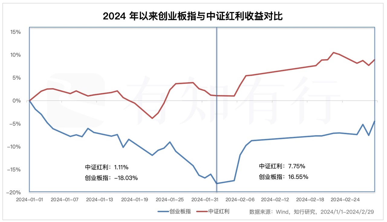 我们把价值风格的代表指数中证红利和成长风格的代表指数创业板指放在一起对比,可以更好地体会两类风格之间的特征。从 1 月 1 日至 2 月 4 日市场整体的下跌行情中,创业板指收益率为 -18.03%,而中证红利同期却上涨 1.11%。而在此后市场在春节前开始的快速反弹行情中,从 2 月 5 日开始到 2 月底,前期表现较差的创业板指上涨 16.55%,而同期中证红利上涨 7.75%,有所落后,但依然跟上了市场的整体行情。整体来看,两类风格之间形成了很好的分散和对冲。