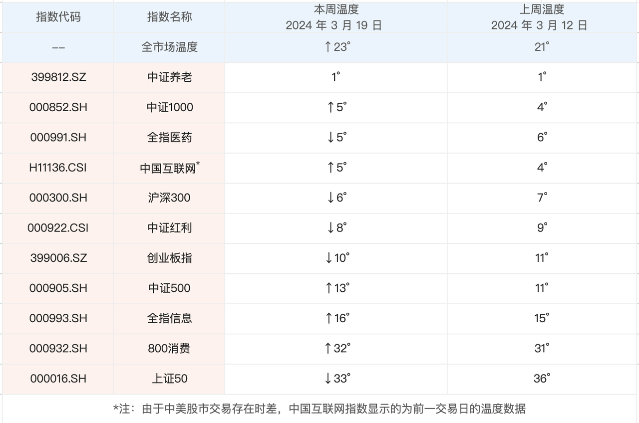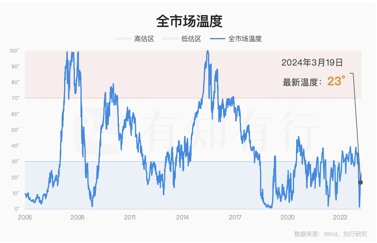 我们先来看看最近一周的市场表现,从上周三到本周二,A股继续保持整体小幅上涨、内部结构分化的局面。代表全市场表现的中证全指上涨 0.75%,多数行业和个股出现了上涨。正因如此,我们最新的全市场温度来到了 23°,与上周相比,小幅提升。