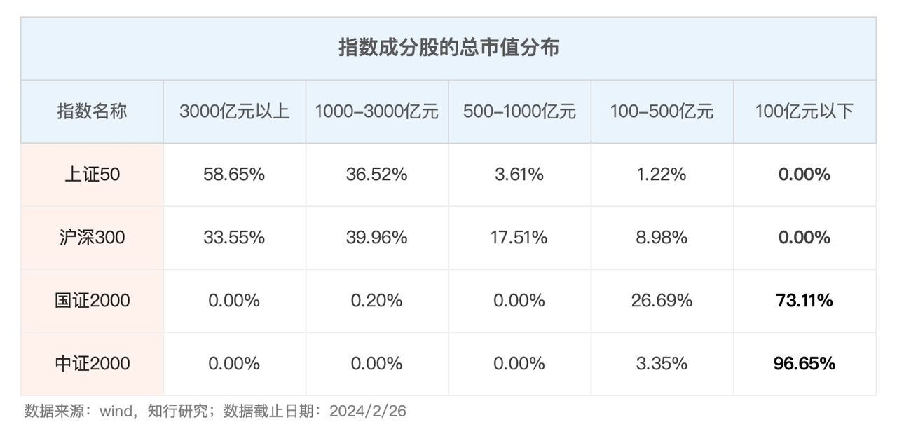 上图展示了每个指数里所包含的成分股的总市值分布情况,其中上证50和沪深300的总市值分布是类似的,都属于大盘股,上证50包含的成分股规模更大一些。而国证2000和中证2000的总市值分布是类似的,都属于小盘股,国证2000比中证2000包含的成分股的规模要大一些。尽管上证50和沪深300、国证2000和中证2000在具体个股和行业分布上是不同的,但它们背后在成分股规模上的风格是类似的。