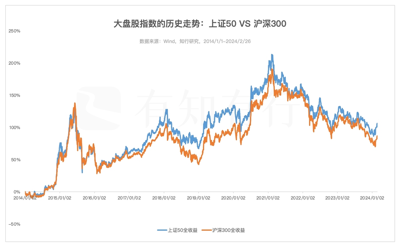 我们拿长钱账户一个投资风格的划分维度来举例说明,同一投资风格的产品,长期的风险收益特征是较为相似的。长钱账户会将股票分为大盘股、中盘股、小盘股,相对应的话,会把指数分为大盘股指数、中盘股指数和小盘股指数。下图展示了大家熟悉的大盘股指数和小盘股指数,其中上证50和沪深300代表大盘股指数,国证2000和中证2000代表小盘股指数。