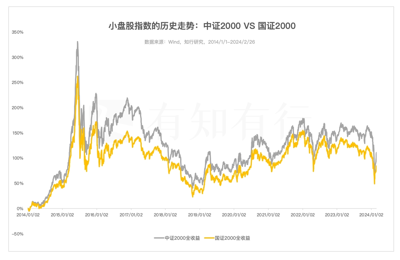 投资风格的相似性,会使得它们长期的风险收益特征会更为相似。上图展示了上证50和沪深300、国证2000和中证2000指数自 2014 年以来的历史走势,很明显能看出来,作为大盘股指数的上证50和沪深300长期走势较为一致,而国证2000和中证2000的长期走势较为一致。