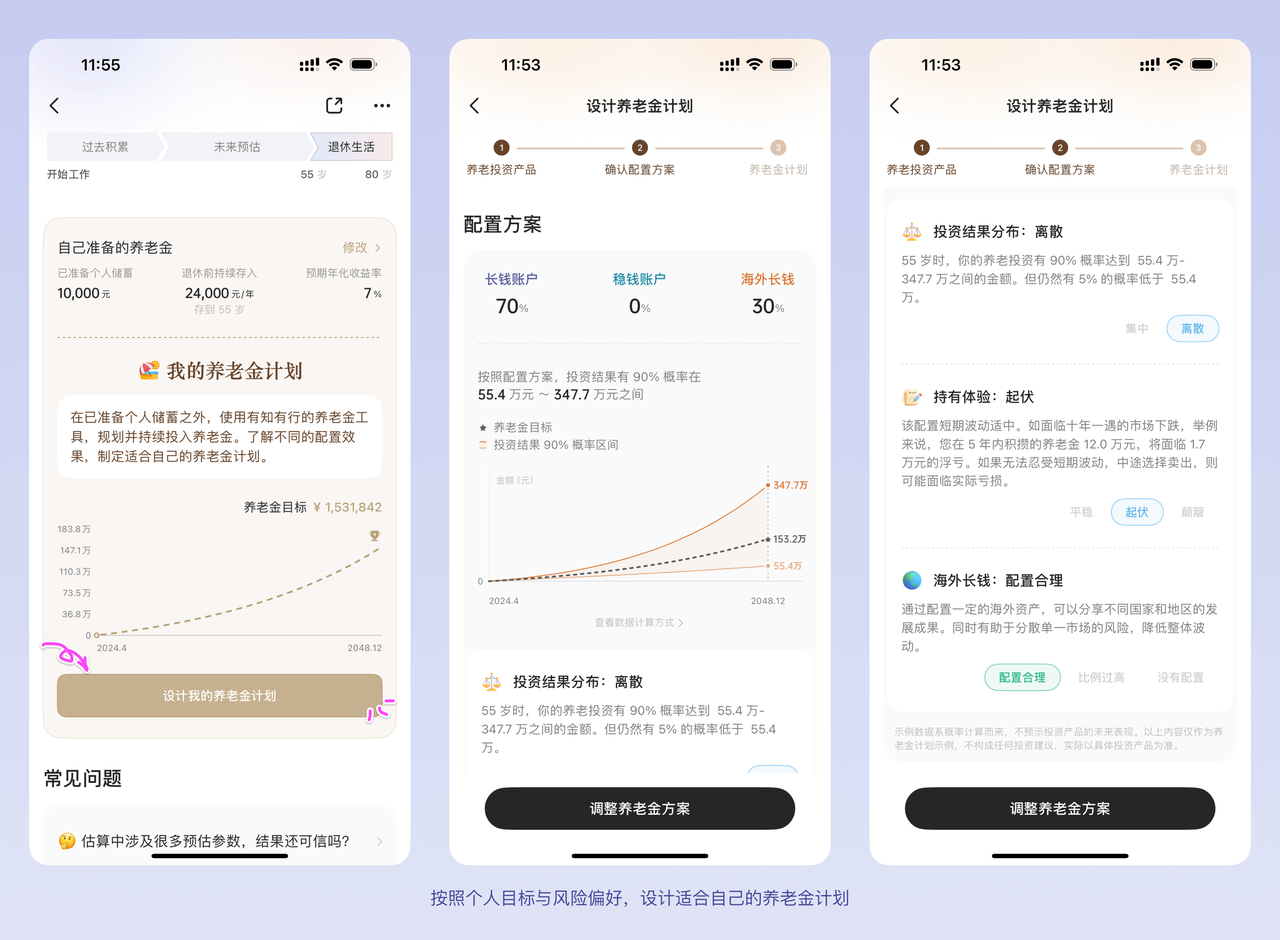 比如,当我们看到退休后预计生活水平会有所下降,那么现在就可以适当增加储蓄,甚至将这笔钱分散配置于不同的资产,比如长钱账户、稳钱账户、海外长钱等。基于你设计的的专属养老金计划,计算器会给出不同配置方案的预估效果。
