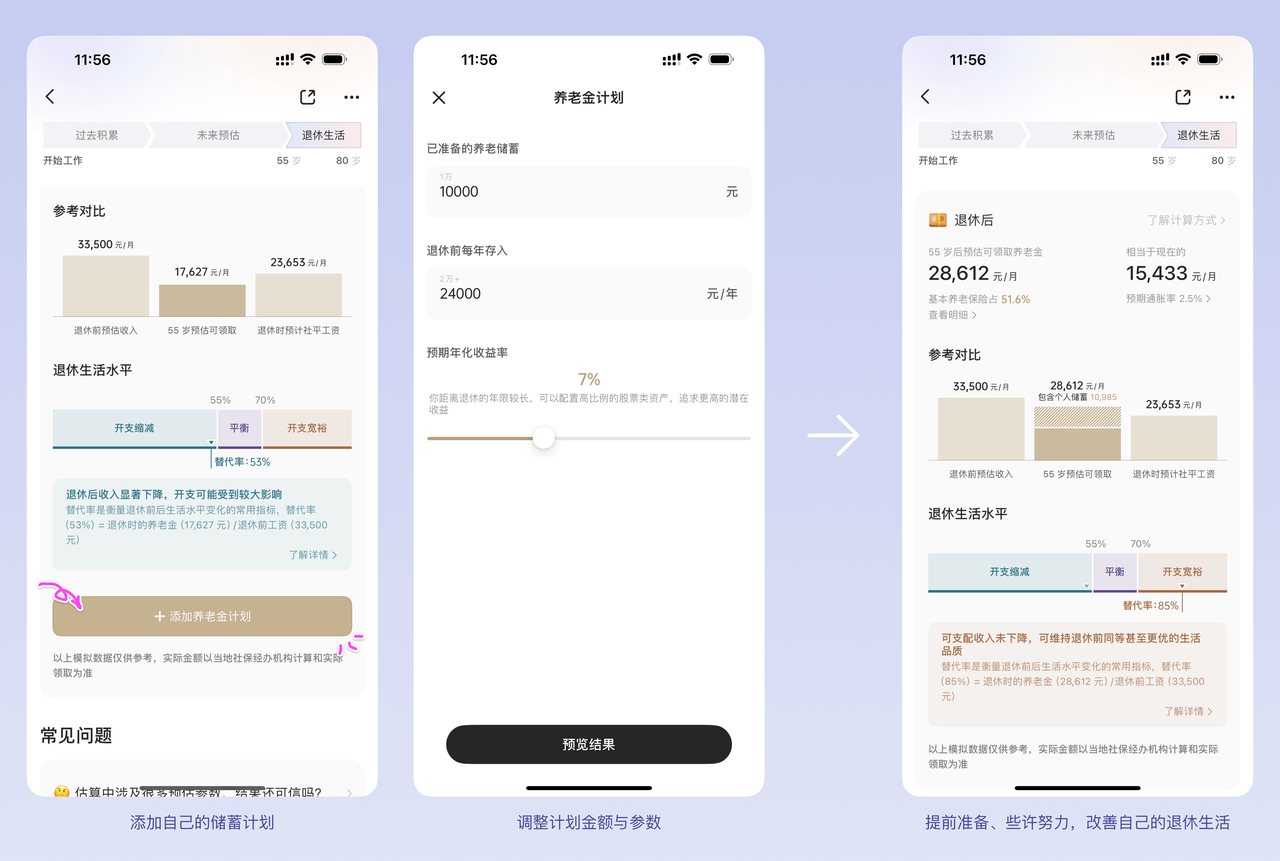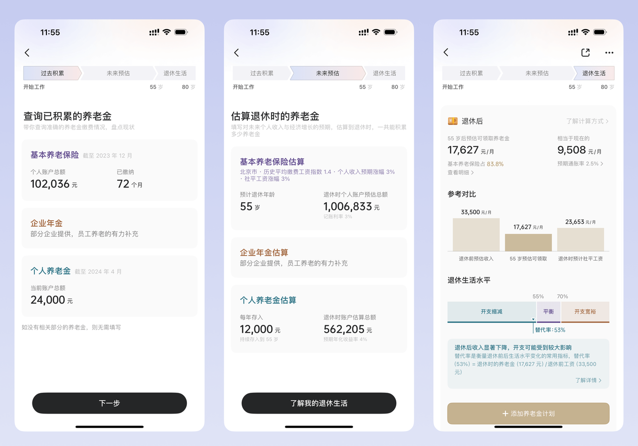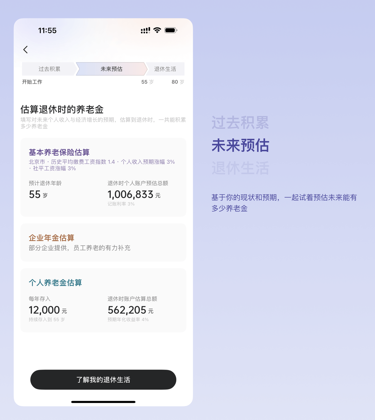 因此,有知有行的养老金计算器,是包含「过去积累」「未来预估」「退休生活」的三段式旅程。