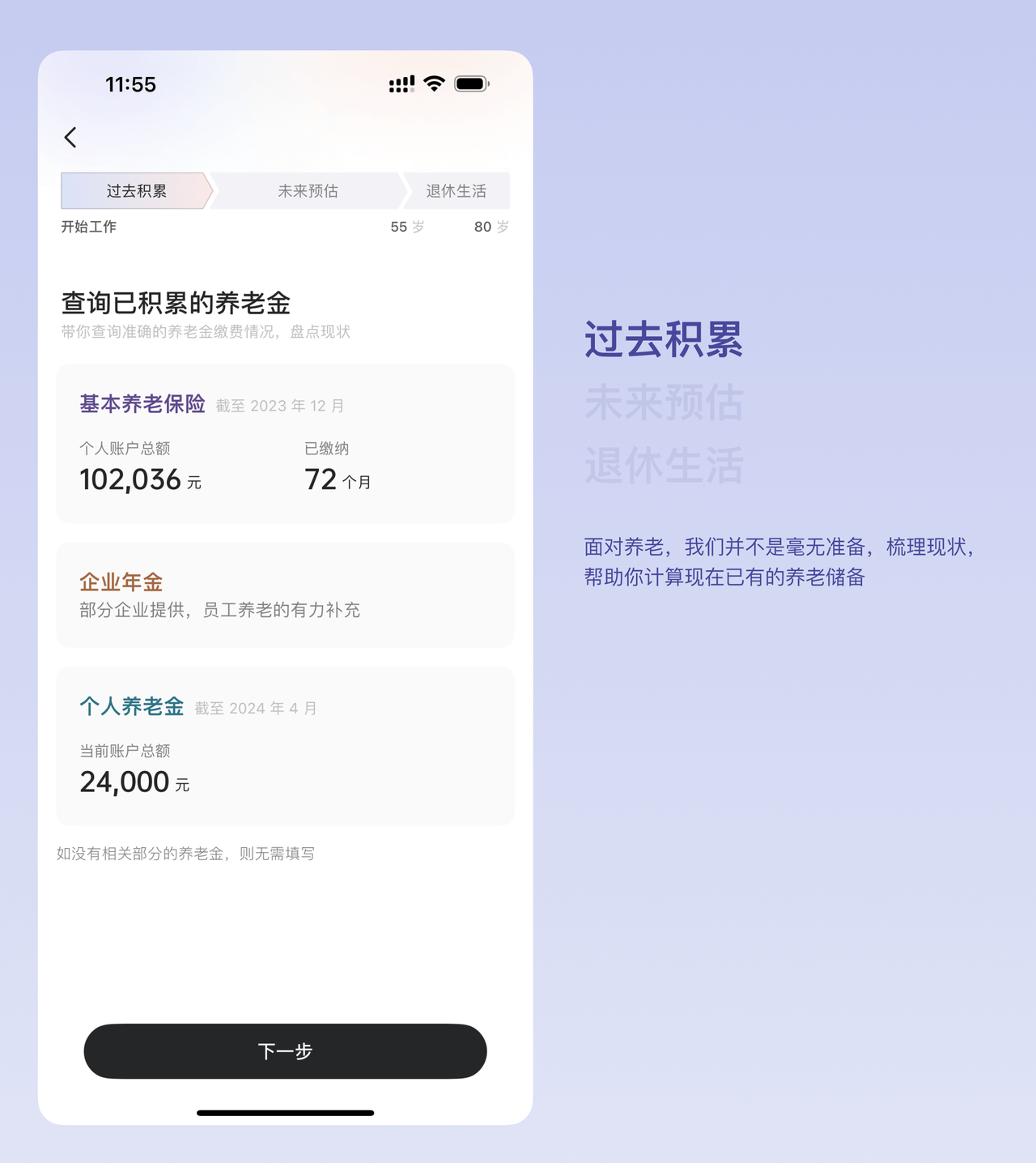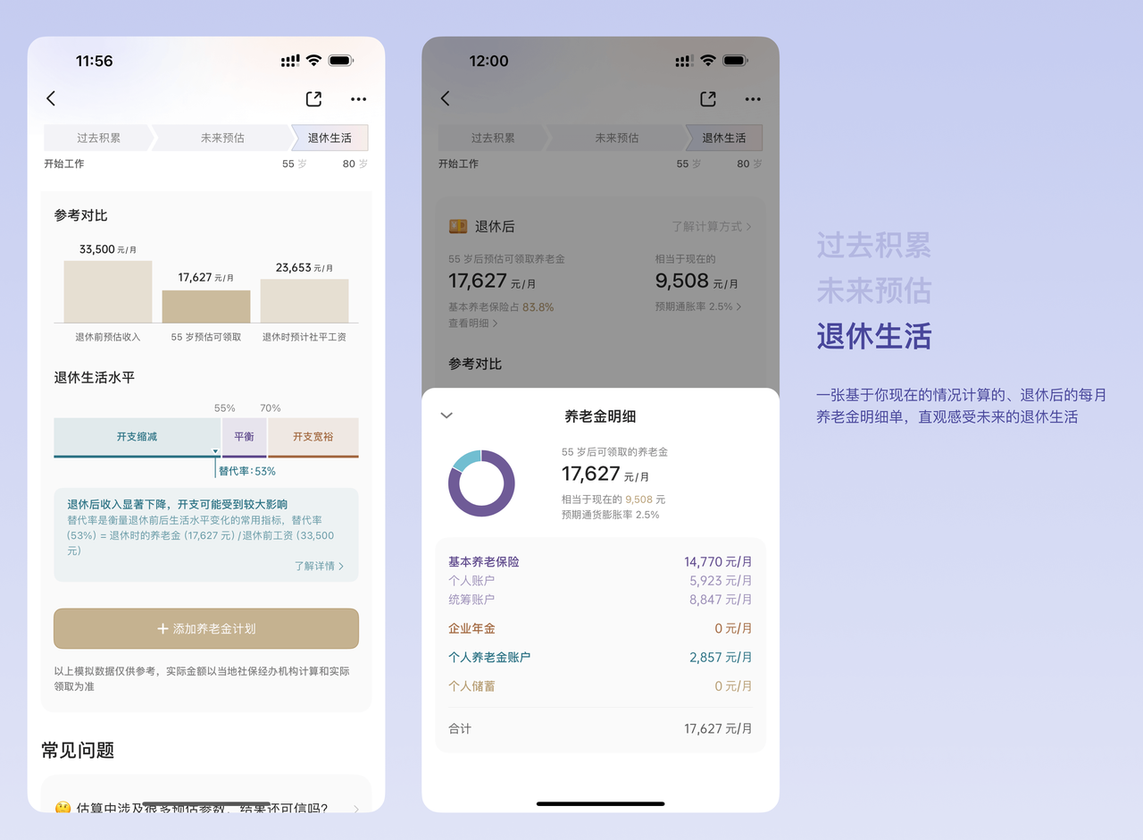 所以,我们给自己的要求是,在力求真实的情况下,尽力减少你查询、输入养老金数据的摩擦,「过去积累」「未来估算」「退休生活」三段旅程也会分别为你提供阶段性反馈。