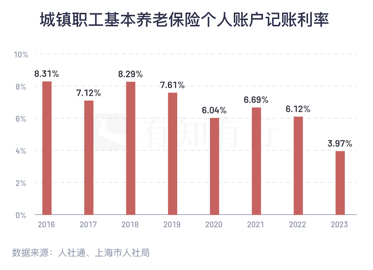 没错,个人账户里的钱每年是有利息的,而且最近几年利率并不低,养老保险个人账户每年计算利息的利率被称为个人账户记账利率。每一年人社部都会统一公布记账利率,2016~2022 年的记账利率在 6%~8%,2023 年是 3.97%。根据规定,每年的记账利率不得低于银行定期存款利率。