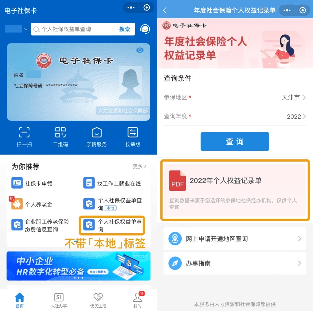 打开微信或支付宝搜索小程序「电子社保卡」,或者直接下载「电子社保卡」App,点击「个人社保权益单查询」,选择参保地区和查询年度,即可查询余额。