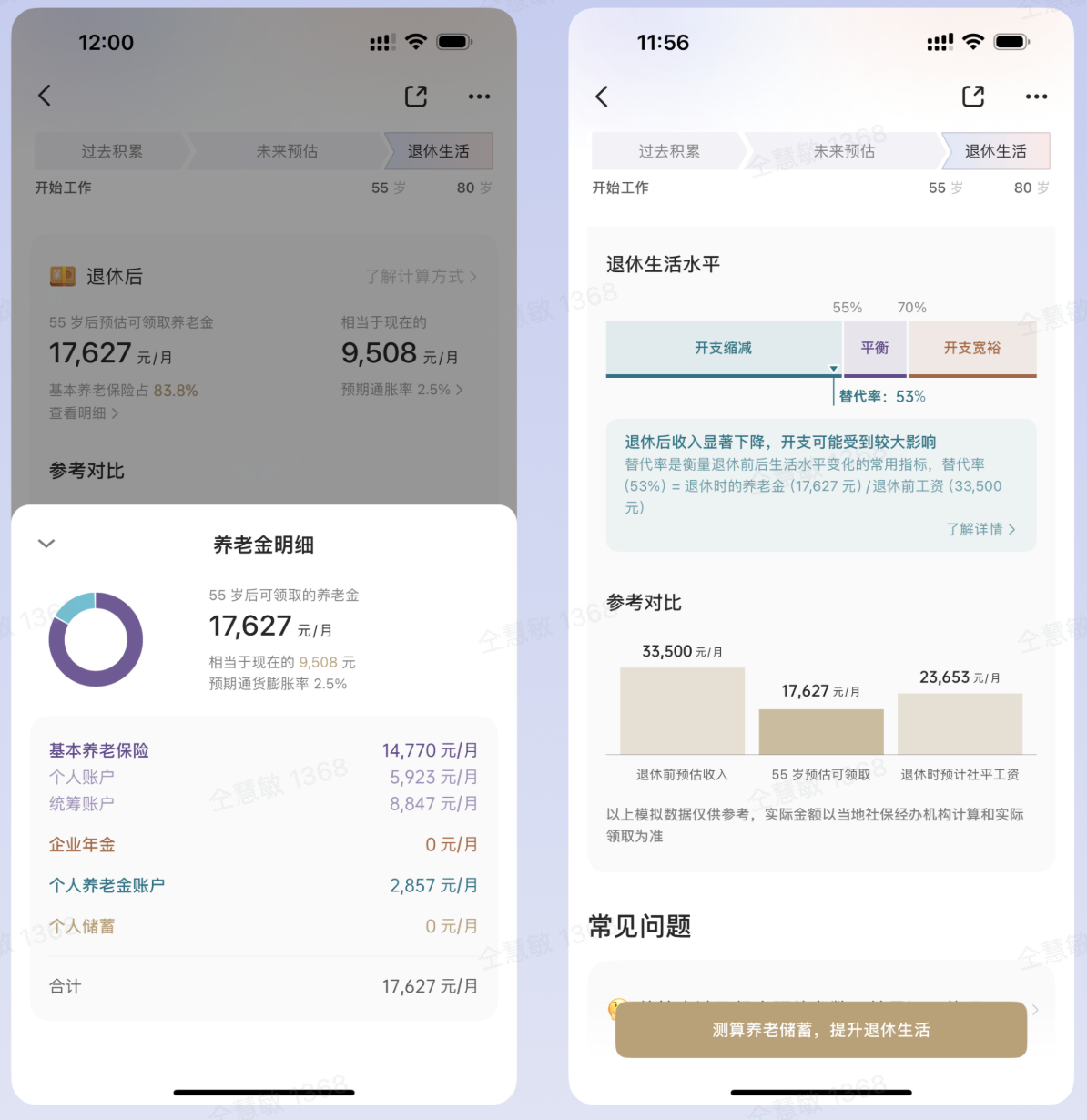 更新至 1.23.0 版有知有行 App,使用「养老金计算器」,可以看到相关对比。