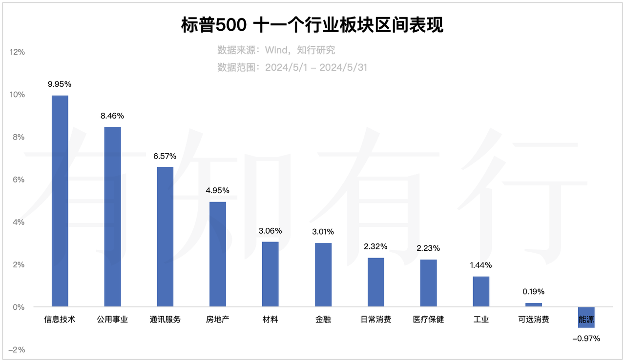 下图展示了标普500覆盖的 11 个行业板块的表现。五月份 11 个行业板块中,10 个行业出现上涨,唯一下跌的是能源板块。「七巨头」的表现依旧亮眼,信息技术板块成为涨幅最大的行业。