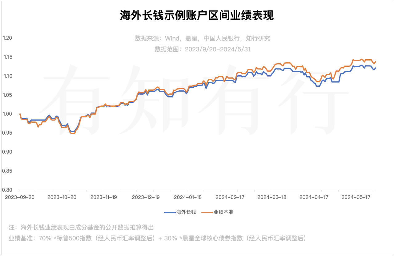 在股债共同上涨的作用下,海外长钱示例账户五月份上涨 3.39%,同期业绩基准上涨 3.95%。自 2023 年 9 月 20 日上线以来,海外长钱示例账户的总回报为 12.07 %。海外长钱示例账户及业绩基准的业绩表现均由 Wind,晨星的公开数据推算得出,汇率数据参考了中国人民银行公布的人民币汇率中间价。