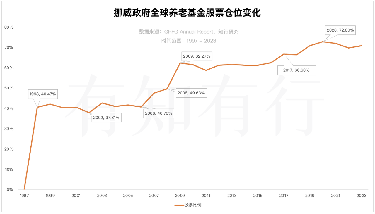 股票是长期收益最高的资产。挪威主权基金基于自己长期的视野,逐步提高了股票在资产组合中的占比。从下面的图表上可以发现,挪威主权基金 1998 年的股票仓位在 40% 左右;2008 年,股票仓位上升至 50%;2009 年,股票仓位上升至 60%。近五年,股票仓位都在 70% 左右。