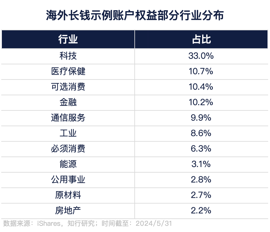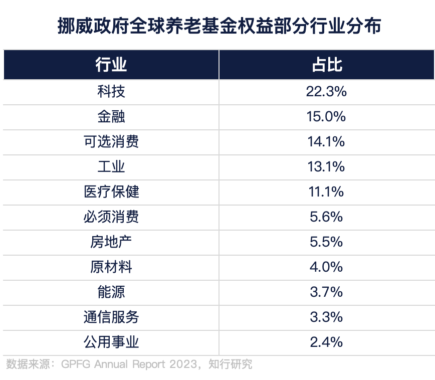 基金在行业上自然也进行了分散。下图为 2023 年挪威主权基金权益投资部分的行业分布,科技、金融、可选消费和工业类是占比最高的四个行业。同时,我们也根据公开数据测算了海外长钱示例账户的行业分布,如下图所示。与挪威主权基金相比,海外长钱在科技板块上的持仓比例相对更高。