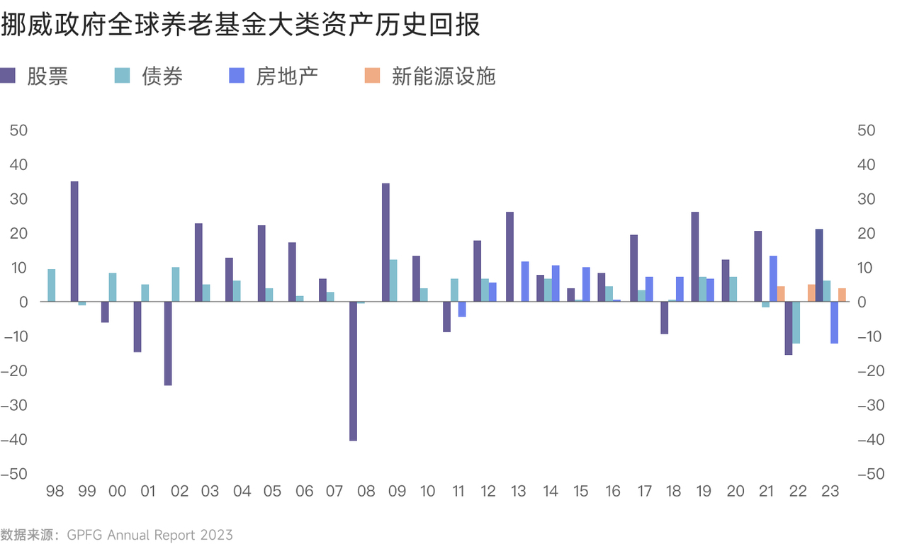 自 1998 年至 2023 年,挪威政府全球养老基金的年化收益为 6.1%。下图是该基金每年各资产类别的回报,以及资产组合的整体回报。