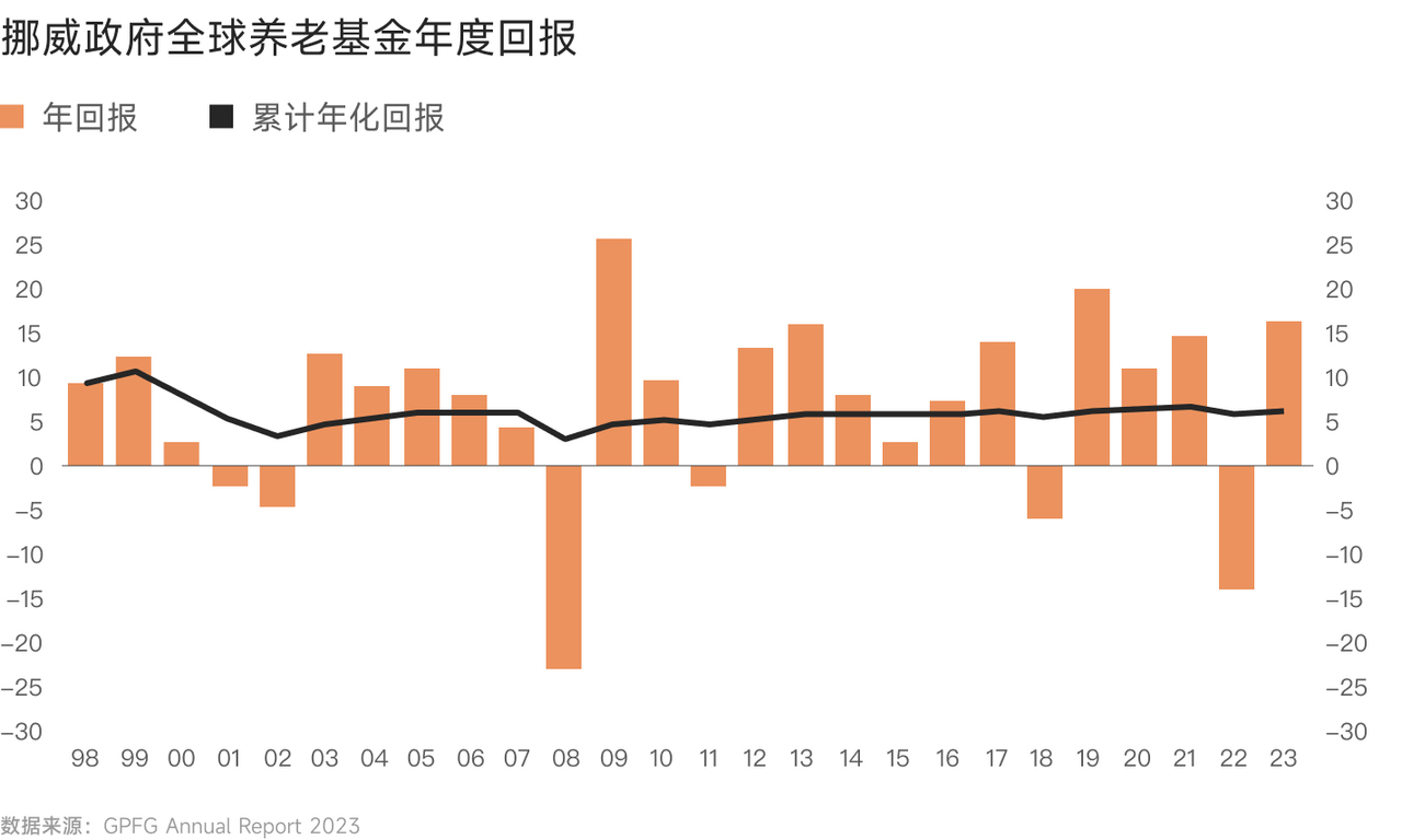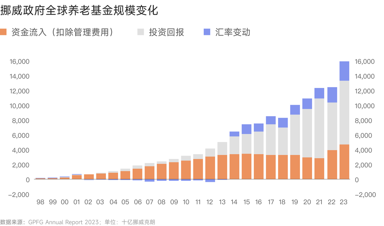 挪威政府全球养老基金每年的收益不太均匀,在 2008 年和 2022 年创下了比较大的跌幅。但我们拉长时间来看整体资产的变化,可以发现它的规模扩大了好几倍。从 2016 年开始,投资回报就超过了本金。