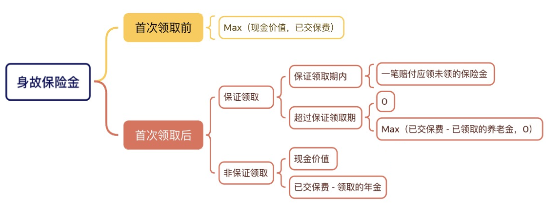 对于非保证领取的年金来说,若被保人在首次领取后身故,比较常见的责任设置有两种:要不然按当年度现金价值赔付给受益人,要不然就按「已交保费减去已领取年金后的金额」进行赔付。